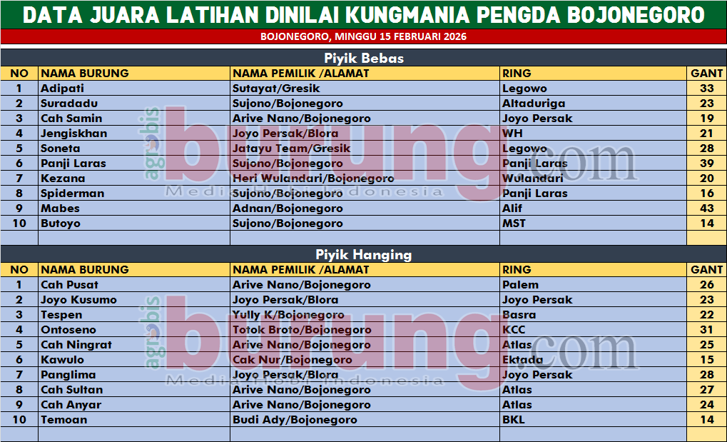 Sementara itu jalannya latihan dinilai yang memainkan dua kelas yitu Piyik Bebas & Hanging menampilkan jago jago terbaik di masing masing kelas, di piyik bebas, jawara Adipati (Kerekan 33) bergelang Legowo milik Sutayat asala Gresik mampu unggul atas jago jago tuan rumah untuk merebut podium pertama. Disusul kemudian jawara Suradadu (kerekan 23) bergelang Altaduriga di poidum kedua dan jawara Cah Samin (Kerekan 19) bergelang Joyo Persak dipodium ketiga.