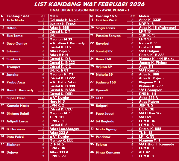 Hendry WAT melanjutkan, untuk memperkenalkan formasi 69 kandang terbarunya WAT BF kembali melakukan promo spesial. Dalan rangka menyambut Hari Raya Imlek 2026 dan Awal Puasa Ramadan 1447 H, khusus untuk kandang-kandang baru yang belum pernah ada bookingan. “Masing-masing seharga 5 juta per pasang. Khusus untuk kandang yang belum ada bookingan. Promo ini berlaku hanya sepekan, hingga 25 Februari 2026. Yang berminat bisa langsung menghubungi WhatsApp saya,” ujar Hendry WAT.
