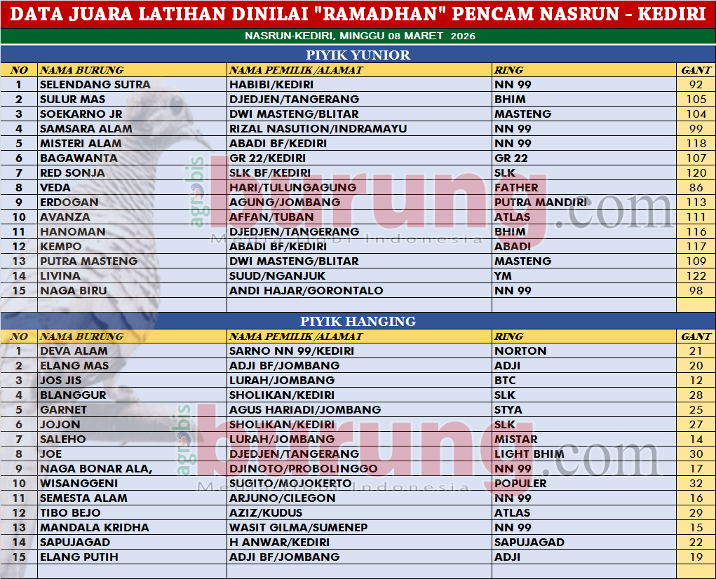 NASRUN-KEDIRI, agrobisburung.com –  Latihan dinilai “Ramadhan Cup” Pengcam Nasrun Kediri kembali digulirkan, walau dilaksanakan di bulan suci Ramadhan gelaran pada Minggu (08/03) di Lap. Nasrun Kediri tetap dipenuhi kungmania dari Kediri dan sekitarnya. Jawara jawara yang hadirpun dari berbagai daerah, namun kali ini tuan rumah, Sarno NN 99 bersama produknya benar benar menguasai tujuh posisi terbaik di kejuaraan, bahkan Selendang Sutra (NN 99) & Deva Alam (Norton) langsung melejit dipodium pertama. Abu Samsun, panitia latihan Nasrun mengatakan bahwa agenda ini dilaksanakan sebagai agenda rutin, walau di laksanakan di bulan Ramadhan jalannya lomba tetap saling bertoleransi. “Kami atas nama tuan rumah dan juga pengcam Nasrun mengucapkan terima kasih atas kehadiran kungmania di acara kami dan selamat kepada para pemenang hari ini atas prestasi jago jagonya. Dan selamat juga untuk produk NN 99 yang menguasai 7 kejuaraan dan dua diantaranya naik podium pertama” ucap Abu Samsun pada agrobisburung.com