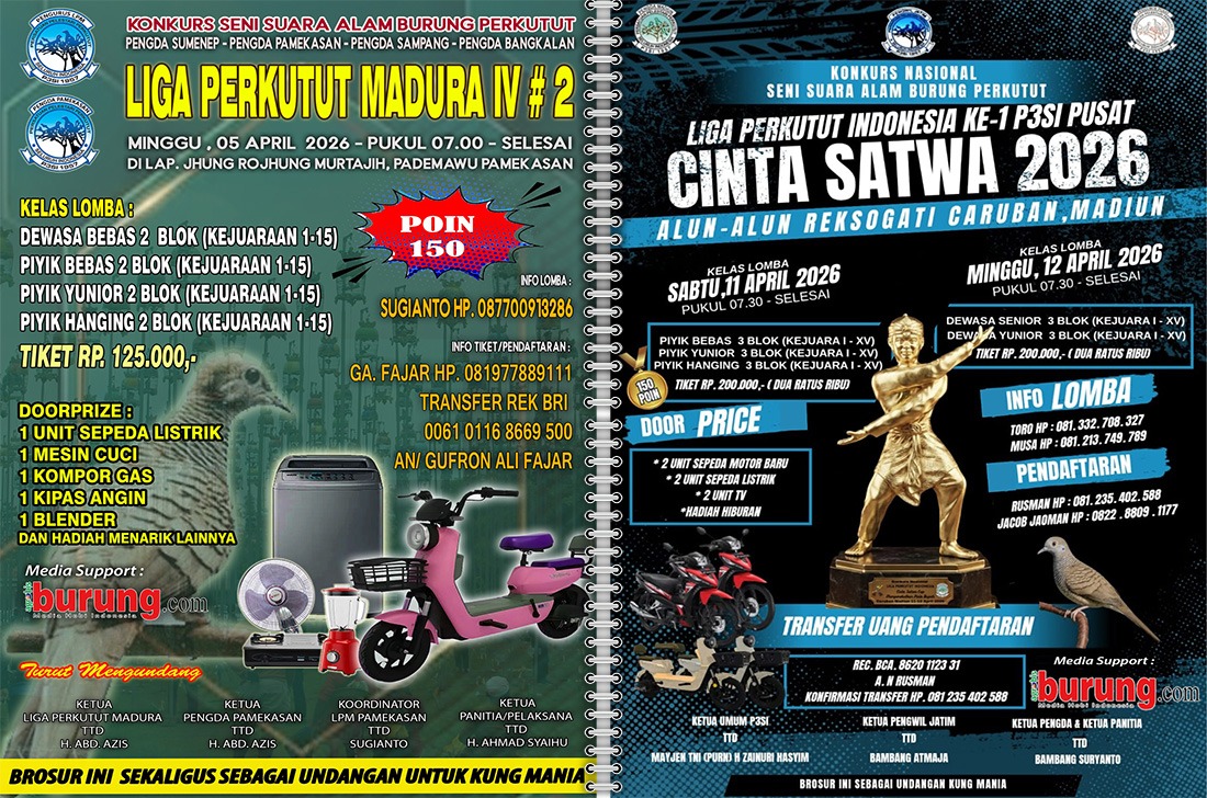 Libur panjang Ramadhan & Lebaran 1447 H/2026 sudah “berlalu” dan saatnya kungmania berburu kemenangan lomba yang punya supremasi bergengsi, apalagi liburan Ramdhan yang sangat minim gelaran ataupun latihan bersama benar benar membuat gelaran di awal April mendatang menjadi “pelampiasannya”. Walaupun ada beberapa agenda “kecil” di beberapa daerah sepekan setelah Lebaran, grengnya masih kalah dengan gelaran pembuka di awal April tersebut yaitu seri ke-2 LPM (Liga Perkutut Madura) di Pamekasan, Liga Batavia dan pembukaan #1 LPI 2026 (Liga Perkutut Indonesia) Cinta Satwa di Caruban – Madiun. Sudahkah kungmania ngelist pedaftaran di dua gelaran tersebut … Check out