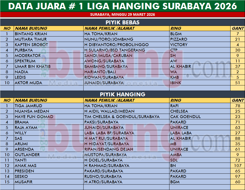 SURABAYA, agrobisburung.com – Pembukaan #1 Liga Hanging Surabaya 2026 di Lap. Beringin pencam Sambikerep benar benar menjadi “obat pemuas” kungmania Surabaya dan sekitarnya pasca libur panjang Ramadhan dan Lebaran. Bertajuk Halal Bi Halal Cup gelaran ini diserbu kungmania Surabaya dan sekitarnya plus beberapa kungmania dari luar kota seperti Sidoarjo, Gresik, Mojokerto, Jombang, Caruban. Dan pastinya gelaran di LHS ’26 ini juga dihadiri burung burung kelas yang bakal diturunkan di gelaran nasional pembukaan LPI 2026 di Caruban. Benny Mintrso, ketua LHS 2026  mengatakan bahwa agenda ini bertujuan untuk mengembalikan “kejayaan” dan marwah Pengda Surabaya yang sempat meredup dalam kegiatan lomba dalam 2 tahun terakhir. Agenda ini adalah untuk menarik kembali kungmania pemula khususnya yang ada di Surabaya dan alhamdulillah ternyata pesertanya antusiasnya sangat luar biasa.