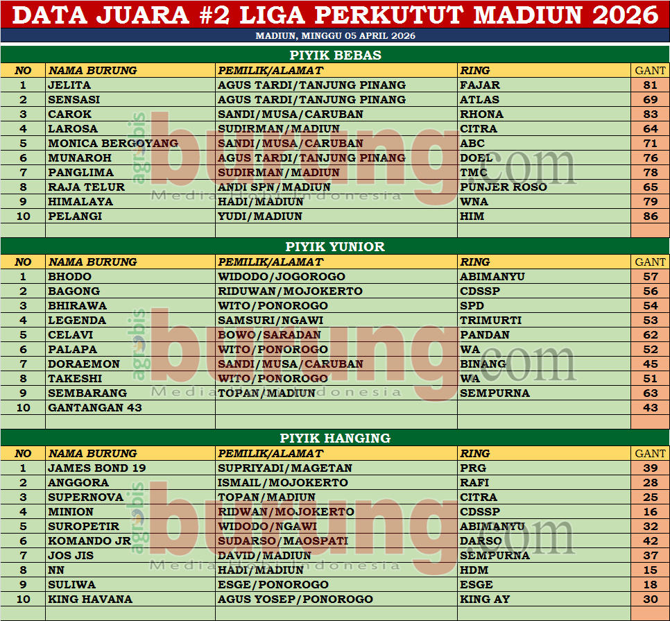 Di gelaran # 2 LP. Madiun 2026 selain jawara jawara Madiun Raya juga hadir jawara nasional yang memilih memanaskan mesin tarungnya ke Madiun dan mereka tampil all out kali ini. Di kelas piyik bebas, duet jawara bernama Jelita (Gantangan 81) bergelang Fajar dan jawara Sensasi (Gantangan 69) bergelang Atlas milik Agus Tardi asal Tanjungpinang yang dikawal Opick Jombang melejit dan tampil joss di podium pertama dan kedua. Sementara dipodium ketiga ditempati jawara Carok (Gantangan 83) bergelang Rhona.