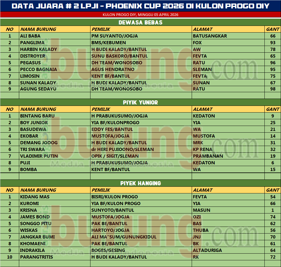 Gelaran LPJI (Liga Perkutut Jogja Istimewa) yang disponsori pakan burung Phoenix pasca lebaran sudah memasuki seri ke-2 dan pelaksanaannya dilakukan pengda  Kulonprogo pada Minggu (05/04). Dan lokasinya berada di Lap. Perkutut Pasar Hewan Terpadu Pengasihdan Sujarwo BA, ketua panitia diawal lomba juga langsung mengikrarkan saling berjabatan tangan “mohon maaf lahir & bathin” karena masih di bulan Syawal 1447 H/2026. “Kami atas nama sengenap panitia mengucapkan terima kasih atas kehadiran kungmania khususnya di wilayah DIY serta ucapan yang sama kepada para sponsor yang terlibat dan juga kepada para kru panitia yang telah mempersiapkan lomba ini bisa berjalan dengan sukses,” ucap Sujarwo BA, ketua panitia.