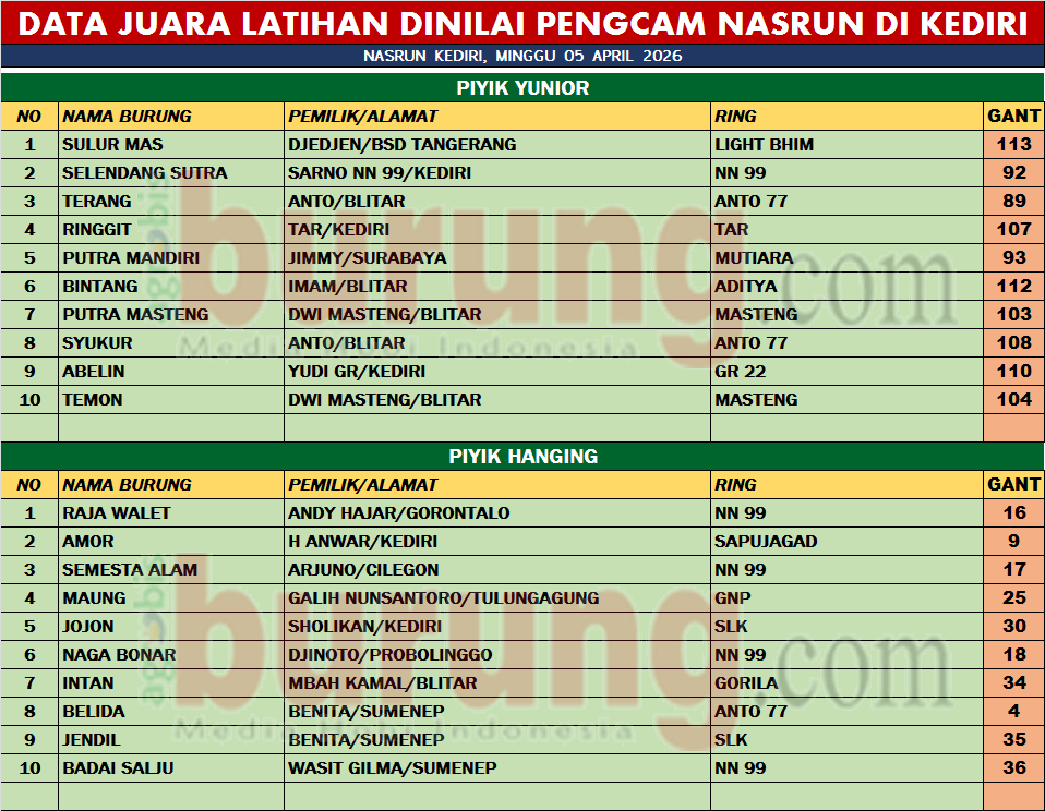 Sementara itu jalannya latihan dinilai kali ini menampilkan debutan debutan muda berbakat yang menguasai permainan dan merebut podium terbaik, di kelas piyik yunior, debutan muda Sulur Mas (Kerekan 113) bergelang Light Bhim milik Djedjen asal BSD Tangerang bikin sensasi dengan anggun indahnya. Menampilkan peforma terbaiknya jawara yang dikawal Bhim Jombang ini mampu mangatasi tekanan dari lawan lawannya untuk merebut posisi pertama dan jawara Selendang Sutra (Gantangan 92) bergelang NN 99 dan jawra Terang (Gangantan 89) bergelang Anto 77 yang sempat mengejar ketinggalan poinnya di babak penentuan harus puas menempati posisi kedua dan ketiga.