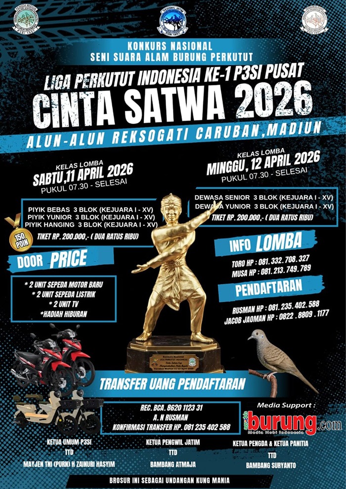 Jelang gelaran nasional sekaligus pembukaan #1 LPI 2026 di Caruban pada Sabtu-Minggu, 11-12 April mendatang tuan rumah benar benar all out, semua persiapan berkaitan dengan lomba dioptimalkan persiapan untuk menyambut kungmania dari seluruh Nusantara. Musa Bintang, panitia pelaksana menyampaikan bahwa sengenap kru panitia siap menerima tetamu dari berbagai kota yang berlomba ke Caruban dan pastinya panitia sudah optimal untuk menyajikan pelaksanaan konkurs/lomba pembukaan LPI dengan sportif, berkelas, meriah dan nyaman. Pastikan juga bahwa jadwal main LPI Cinta Satwa 2026 di Caruban pelaksanaanya pagi pukul. 07.00 sampai selesai, baik itu hari sabtu (kelas piyik) dan juga hari Minggu (kelas dewasa), sekali lagi gelaran lombanya semuanya di pagi hari dan dibuka langsung Bupati Madiun, H. Hari Wuryanto SH, M.Ak !!!