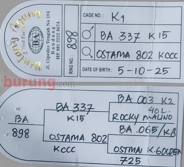 Singa Bukit yang masih berusia 5 bulan berasal dari salah satu kandang unggulan BA K-1 dengan indukan jantan BA K-15 dan betina Ostama K-CCC. Di-take over Defri Eyaka dari Sintabrata BA Bandung sebelum bulan puasa.