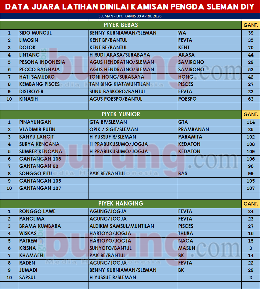 Sementara itu hasil dari latihan dinilai kamisan di Sleman mengantarkan jawara terbaik di masing masing kelas, di kelas piyik bebas, debutan muda Sido Muncul (Kerekan 39) milik Benny Kurniawan asal Sleman membuat kejutan di kelasnya dengan menyodok ke posisi pertama. Jawara bergelang WA ini mampu mengecoh lawannya Limosin (Kerekan 35) bergelang Fevta dan jawara Dolok (Kerekan 70) bergelang Kent yang menyusul menyodok di posisi kedua dan ketiga.
