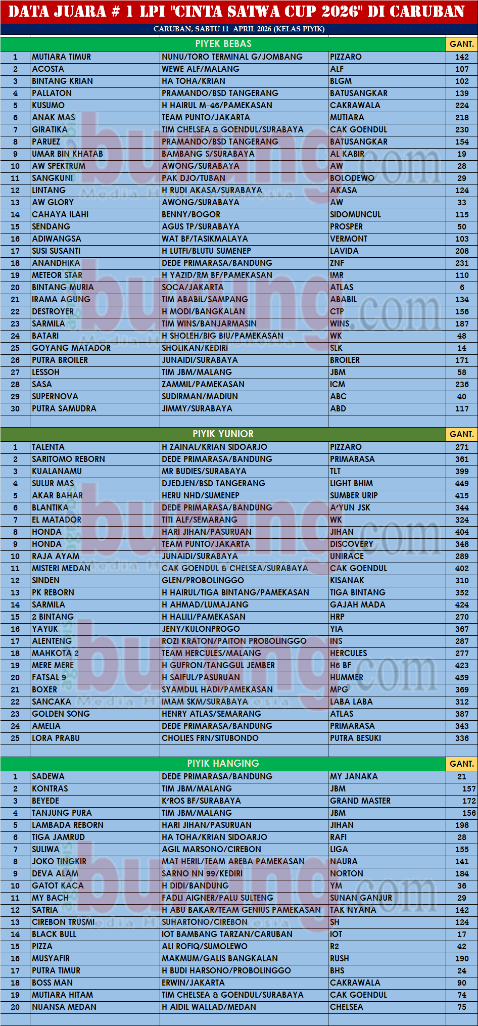 Data Juara # 1 Liga Perkutut Indonesia “Cinta Satwa Cup 2026” Caruban, Pesertanya Tembus 15 Blok