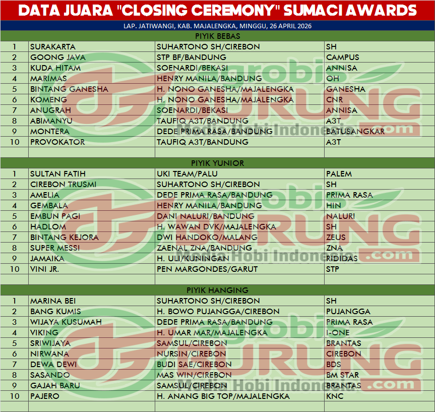 Kemeriahan pada gelaran penutup Liga Sumaci 2025 tersaji dalam “Closing Ceremony” Sumaci Awards di lapangan Jatiwangi, Majalengka, Jawa Barat, Minggu (26/4/26). Hajatan kolaborasi 3 Pengda (Sumedang+Majalengkw-Cirebon), yang dimotori 3 tokoh perkutut Jabar: H. Nono Ganesha (Majalengka), Ancu Sunardi Platinum (Cirebon) dan Roy Fajri (Sumedang), plus Maulana Fajar Gendhis (Majalengka) sebagai ketua Liga Sumaci. Liga ini diadakan dalam rangka menggali potensi pemula sebagai ajang pembuktian eksistensi kungmania Jabar yang tetap berkibar di pentas nasional.